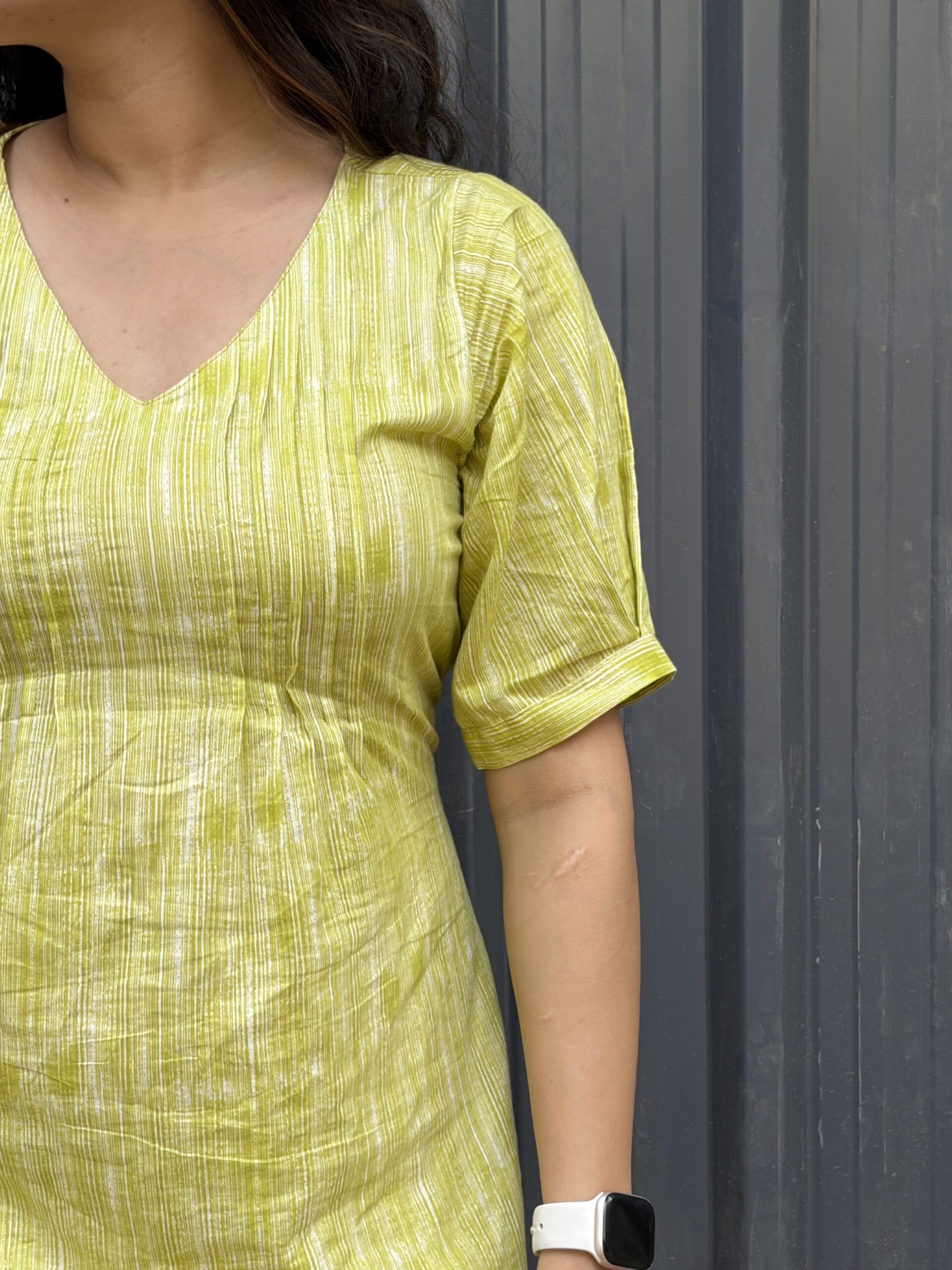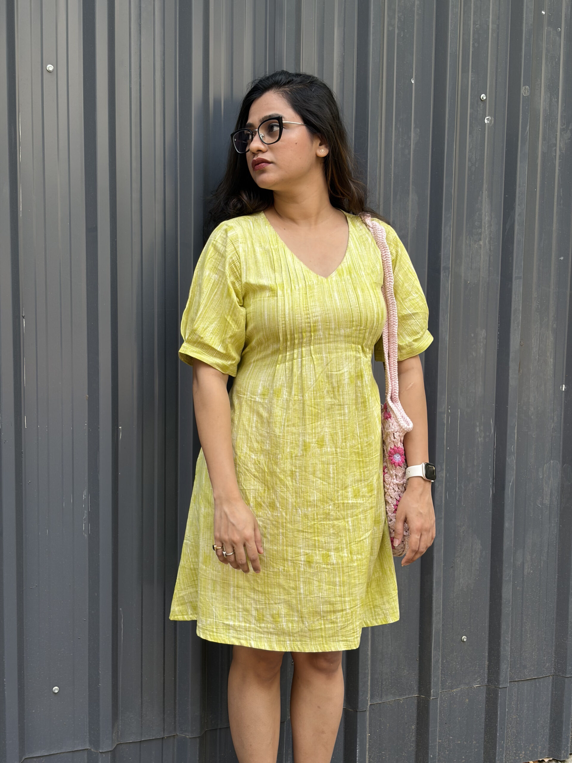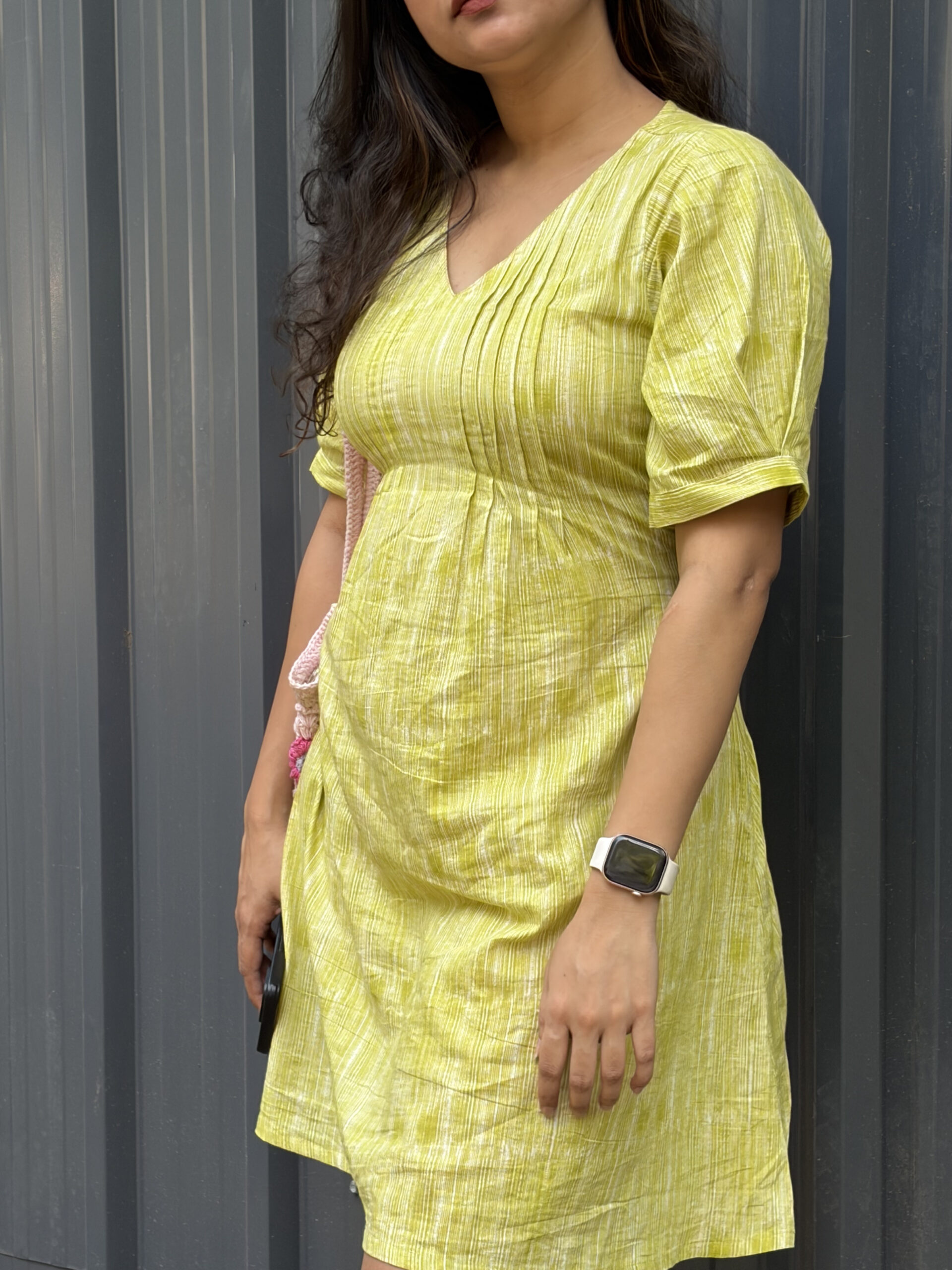 Lightweight green cotton dress made for everyday comfort. Features a flattering V-neck and an adjustable back knot for a perfectly fitted look. Soft, breathable, and easy to wear all day.